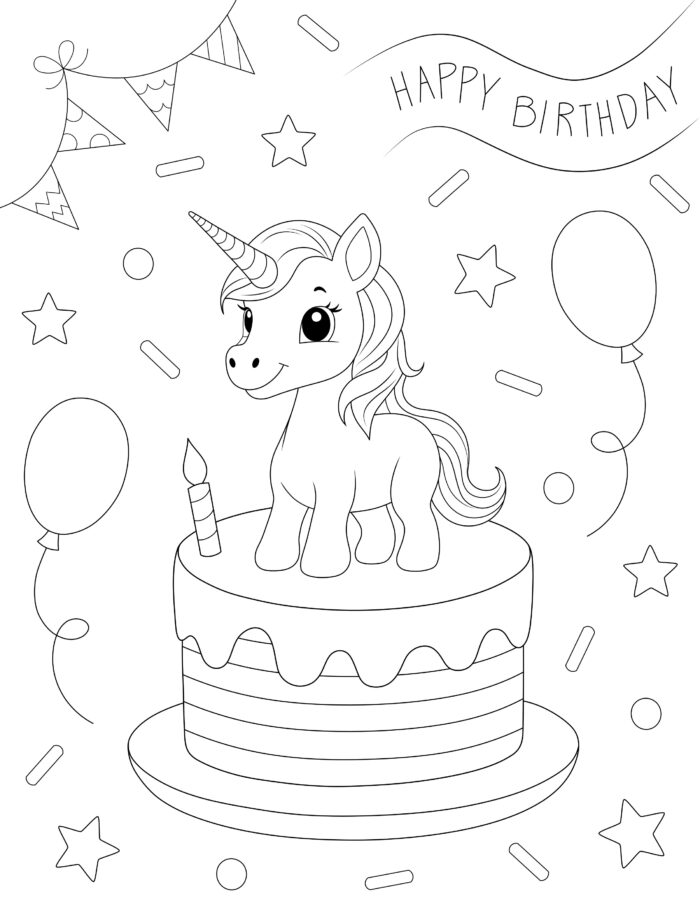 Laissez libre cours à votre imagination : les enfants pourront inventer tout un décor autour de cette licorne de fête, et s’évader dans un monde merveilleux où les licornes sont les reines des anniversaires. Ce coloriage est une belle façon de stimuler la créativité, tout en s’amusant !