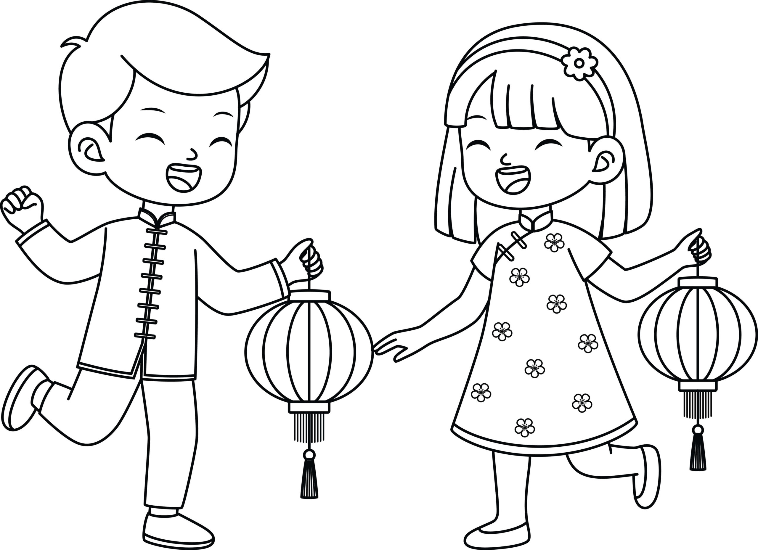 Coloriage Nouvel An chinois enfants en tenue de fête à télécharger et imprimer gratuitement