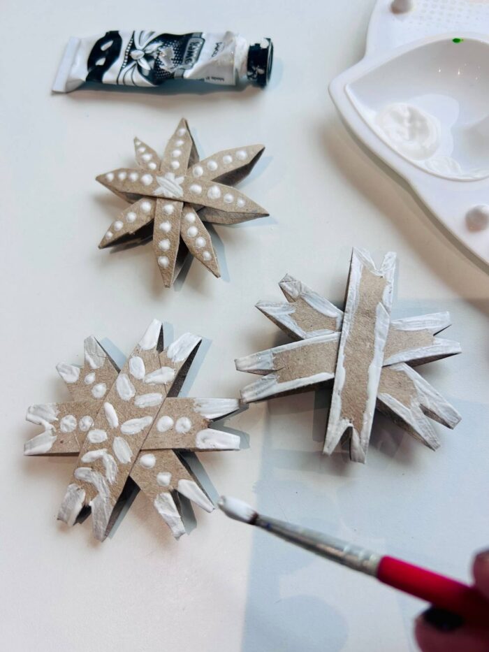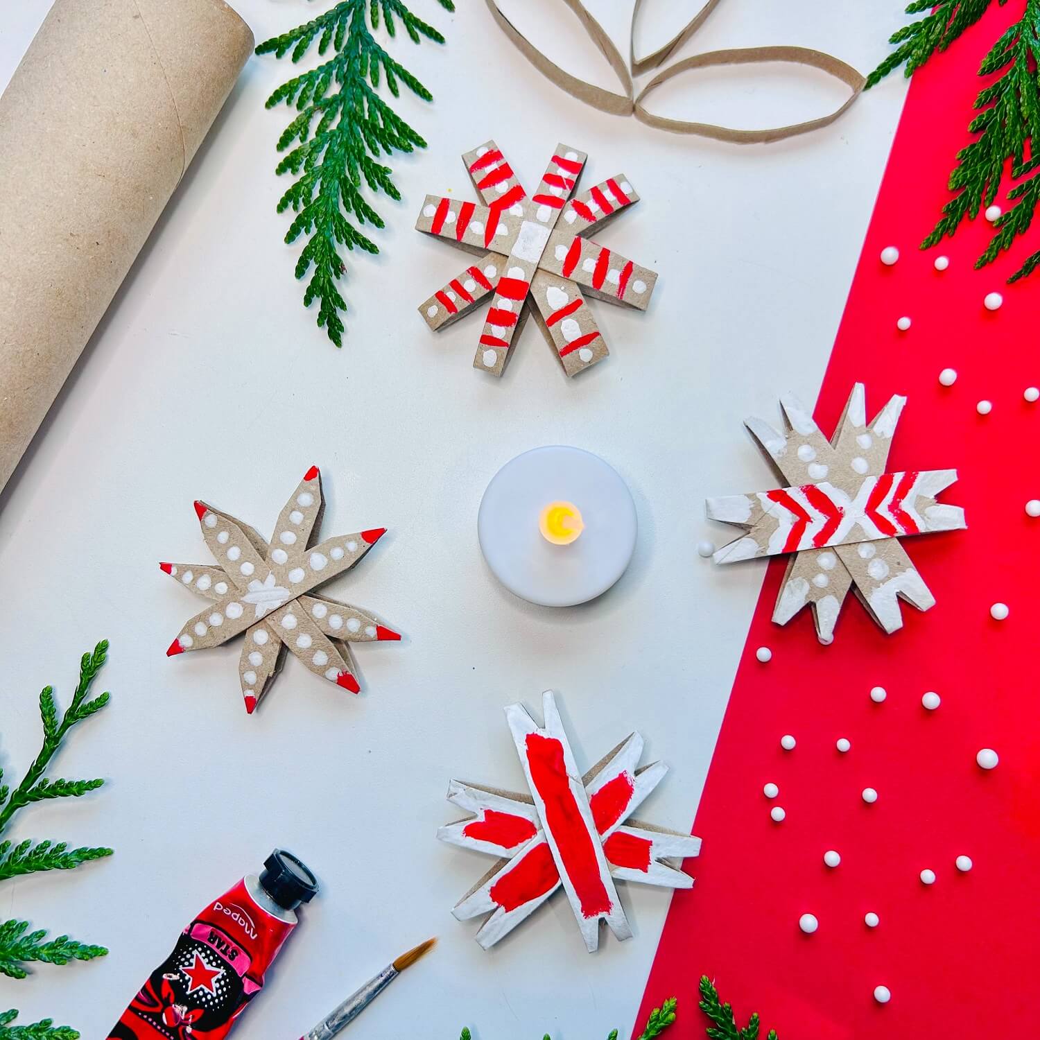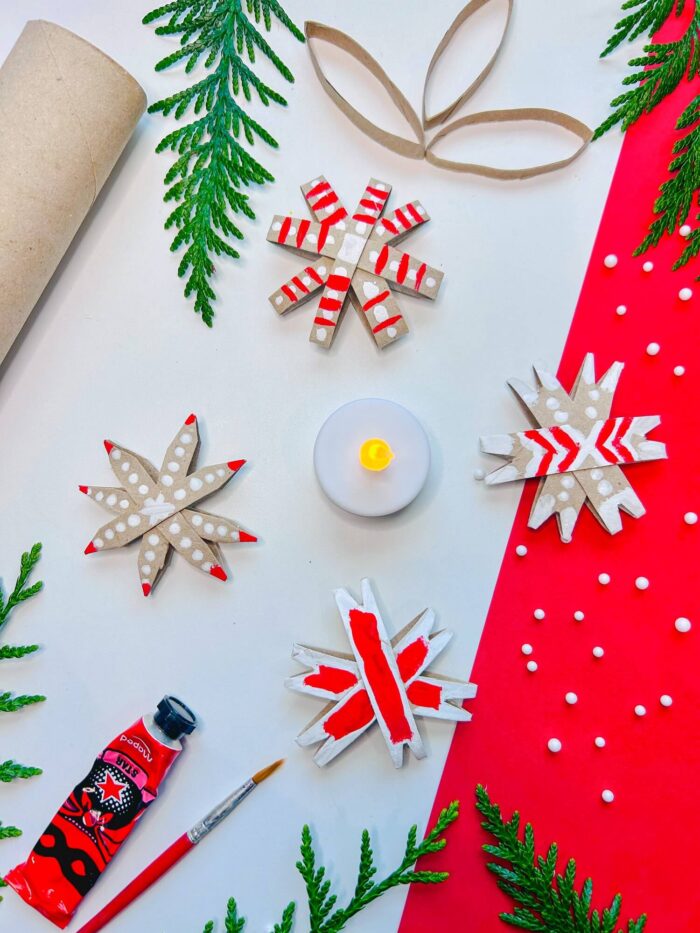 Cette activité créative est parfaite pour préparer les fêtes de fin d’année tout en recyclant ce qu’il y a à la maison ! Les enfants pourront peindre leur étoile avec leurs couleurs festives préférées : doré, argenté, rouge, vert… Une fois les étoiles sèches, ajoutez un petit ruban pour pouvoir suspendre la décoration dans le sapin ou la poser en décoration de table.