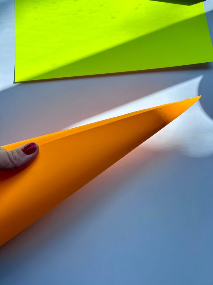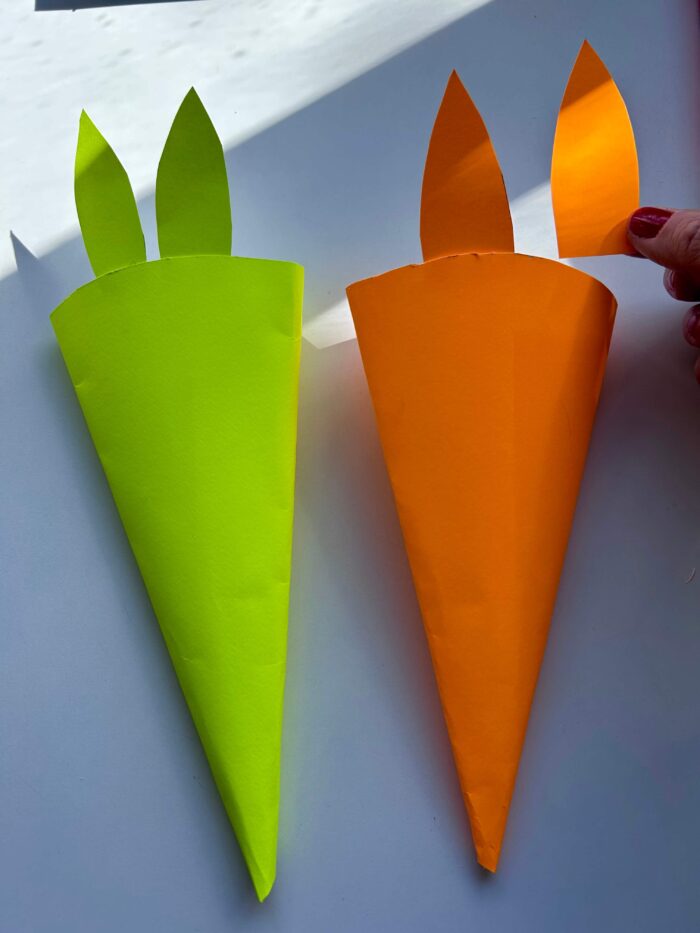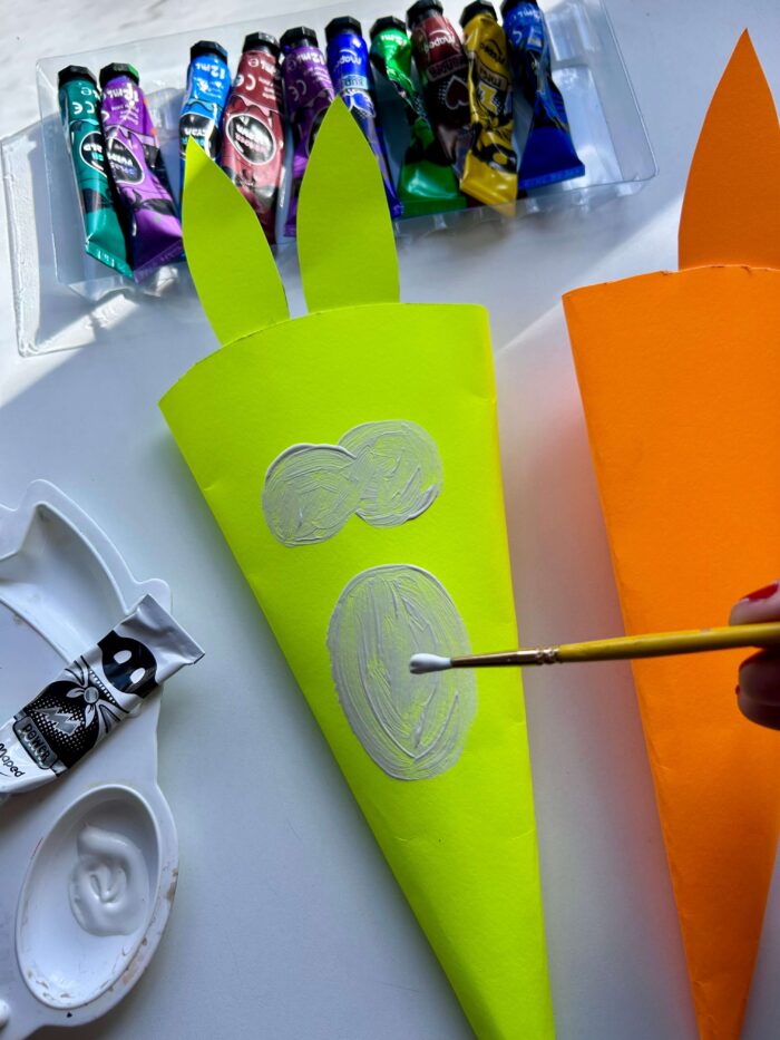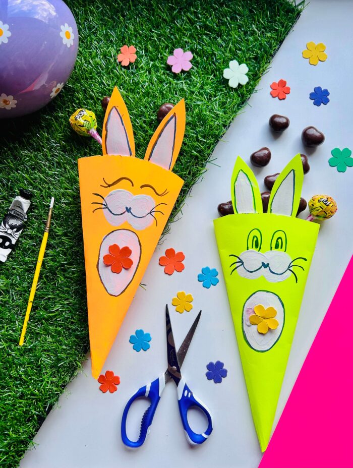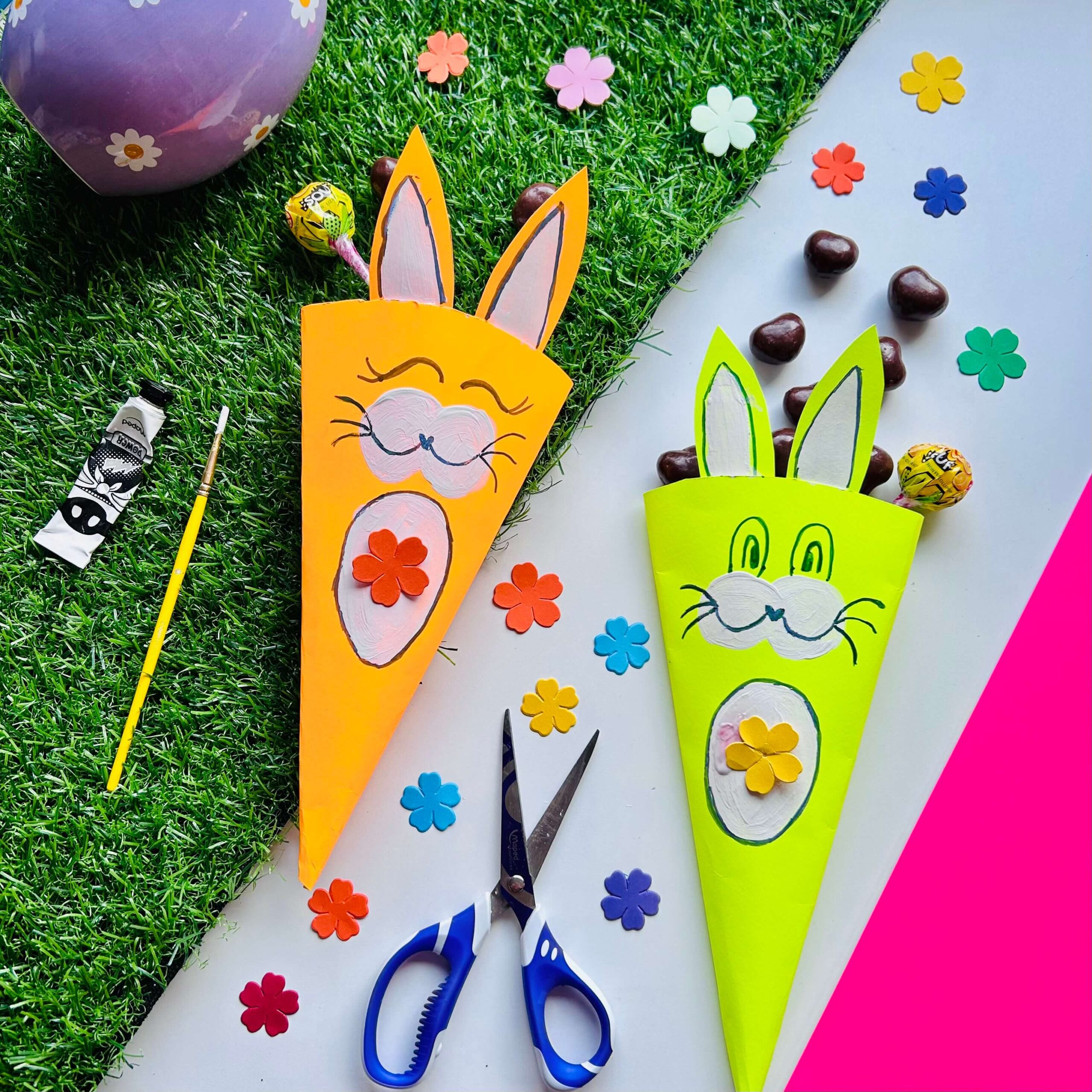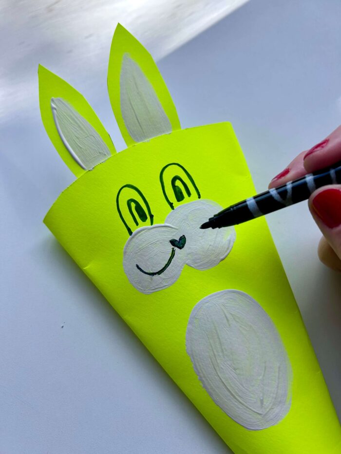 Cette activité consiste à créer un cône en papier qui prend la forme d’un lapin de Pâques. Le cône est d’abord formé et agrafé, puis découpé pour obtenir une base régulière. Des oreilles sont dessinées dans les chutes de papier et collées à l’arrière. Le ventre, les babines et l’intérieur des oreilles sont ensuite peints, avant d’ajouter le visage du lapin au feutre. Le cône terminé peut être rempli de chocolats ou de petites surprises pour Pâques !